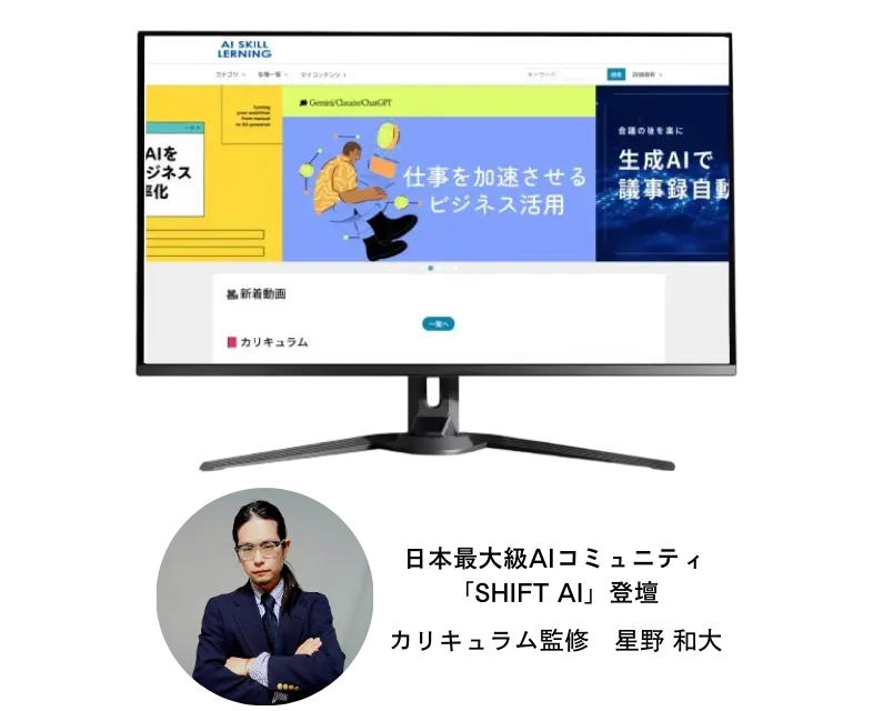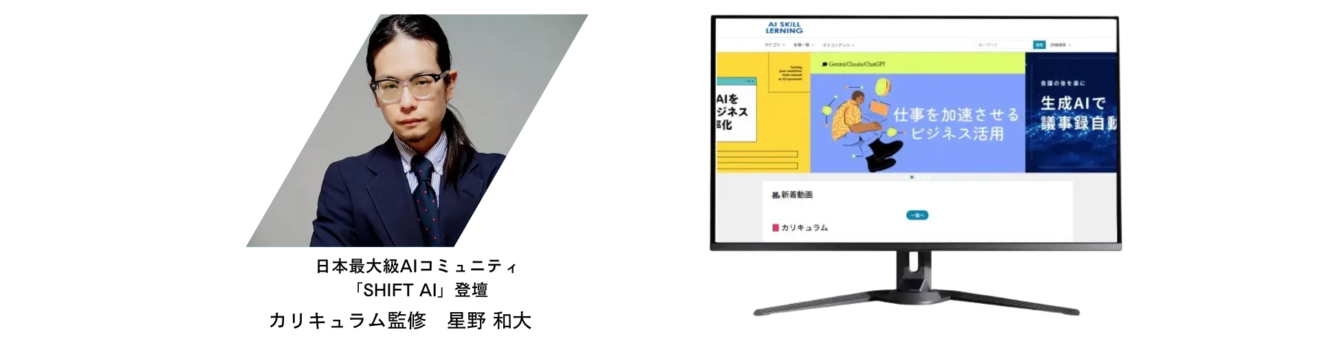 体系的な知識を学び、実際のビジネス課題でAI活用を体得する2本柱で構成。