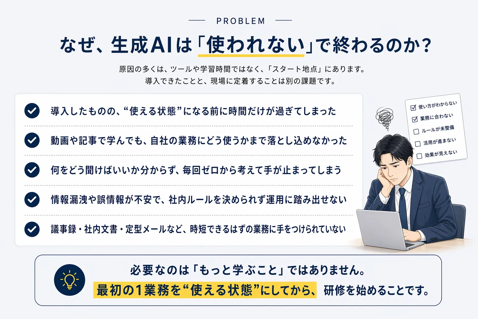 学ぶだけでは、生成AIは現場に定着しません。