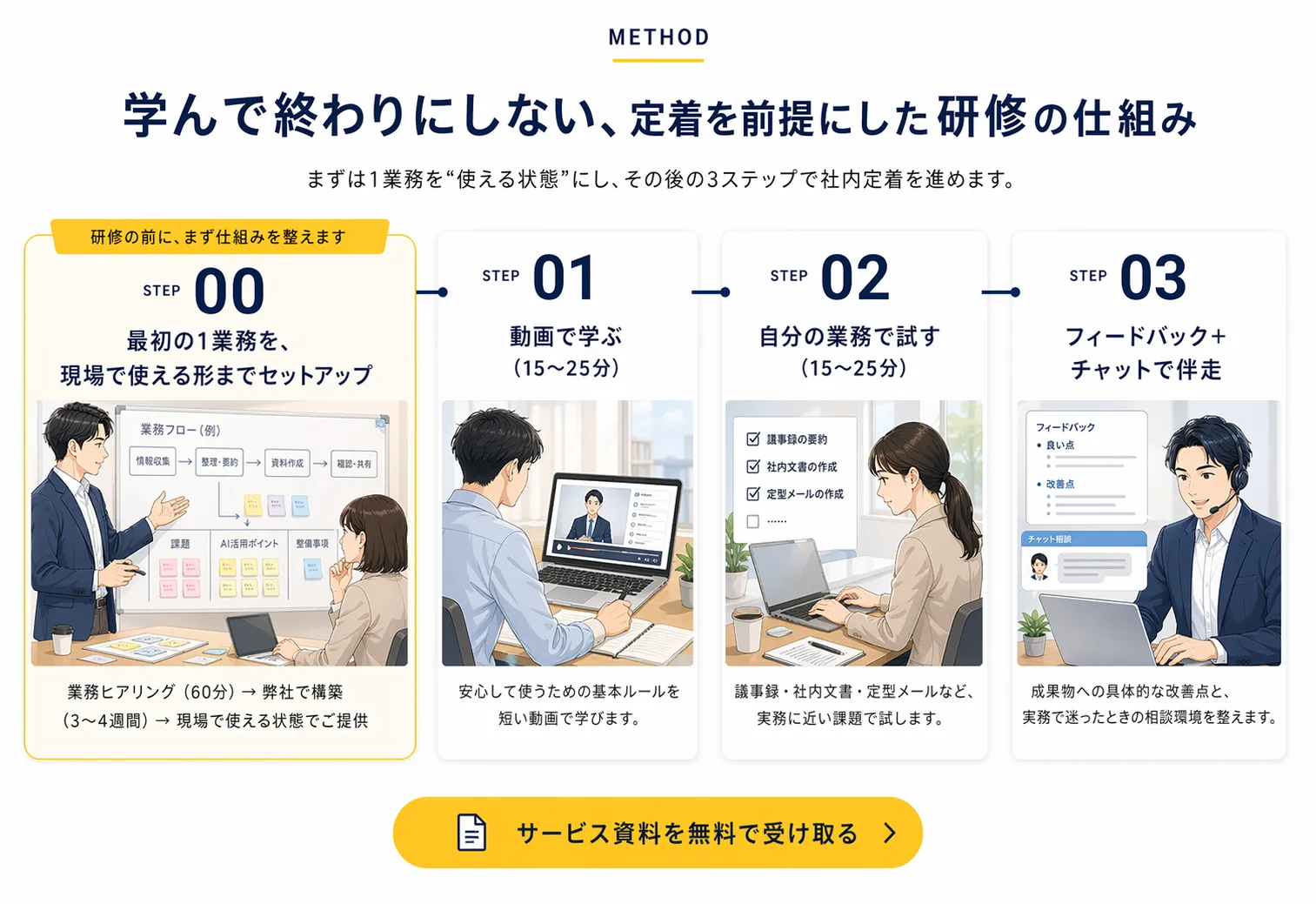 御社専用カリキュラムに沿って、実際の業務で繰り返し使い、成果の出る型を定着させます。STEP 0で整えた業務を起点に、他の業務へも展開していきます。