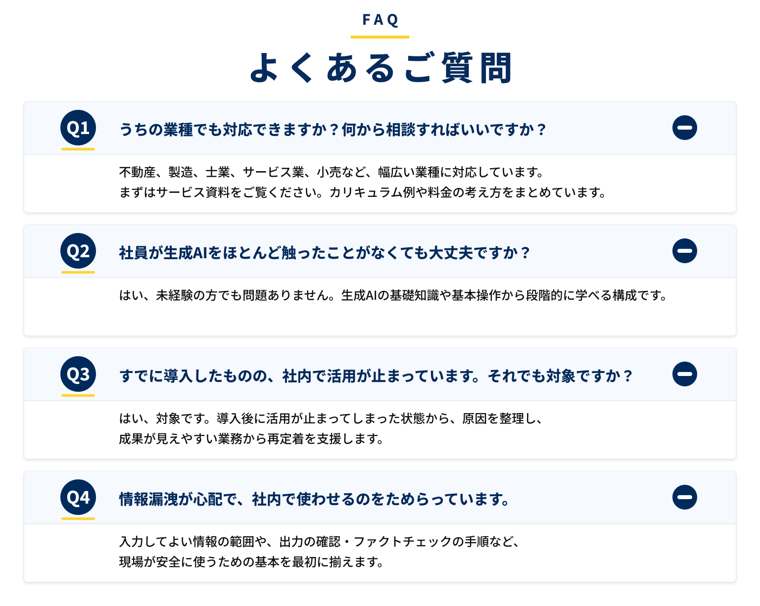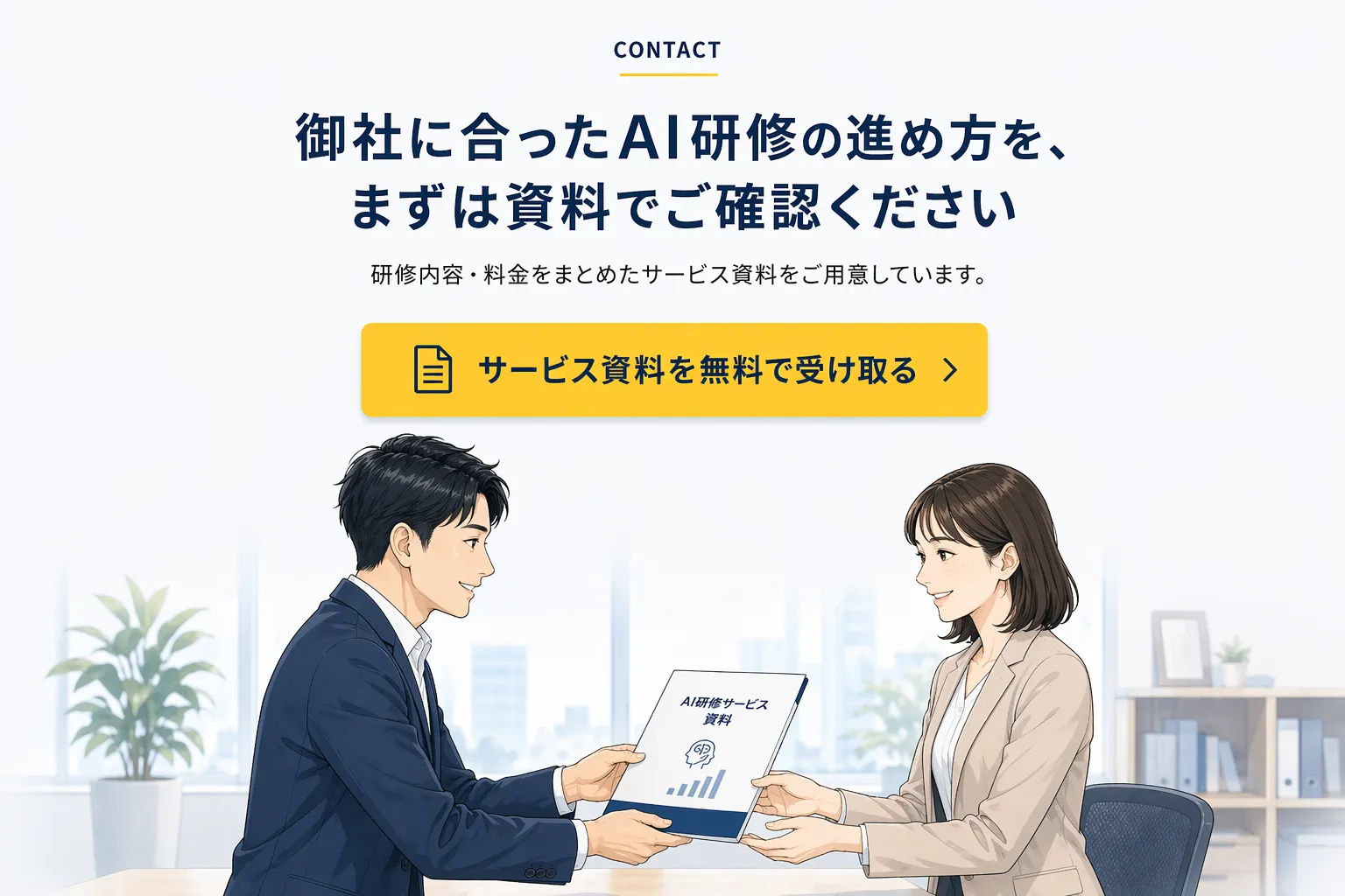 不動産、製造、士業、サービス業、小売など、幅広い業種に対応しています。まずはサービス資料をご覧ください。カリキュラム例や料金の考え方をまとめています。資料をご確認いただいたうえで、御社の業種・業務をヒアリングし、専用カリキュラムをご提案します。