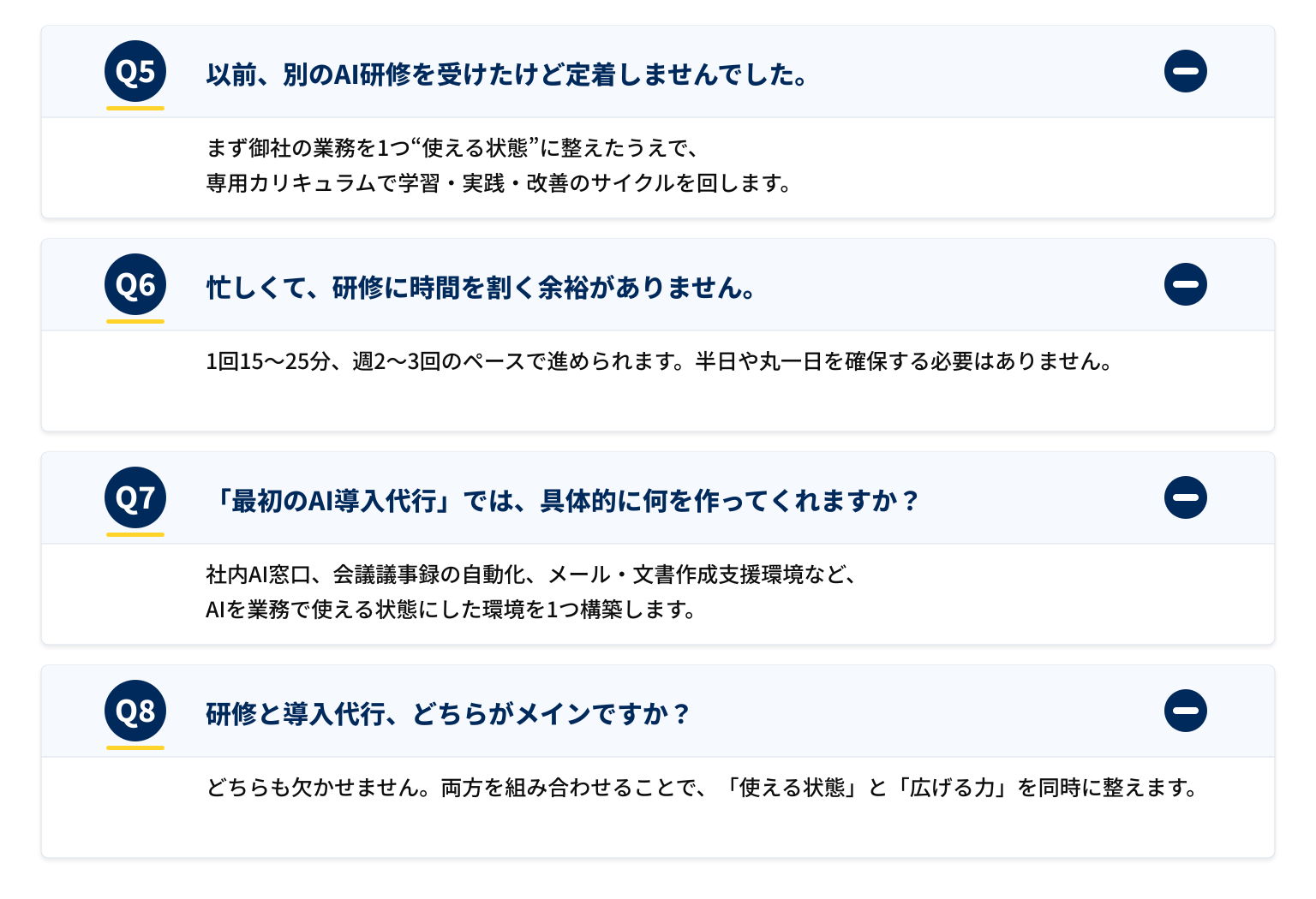 どちらも欠かせません。導入代行だけでは社内に広がりにくく、研修だけでは最初の1業務が"使える状態"になりません。両方を組み合わせることで、「使える状態」と「広げる力」を同時に整えます。