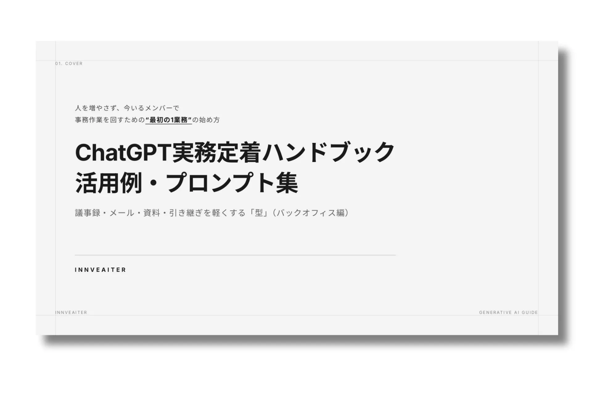 本資料では、効果が出やすい”最初の1業務”に絞って、議事録・メール・資料・引き継ぎをすぐに試せる「型」をまとめました。